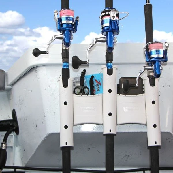 The RodStow Triple is available in black or white, comes with stainless steel fasteners and can be installed in minutes. It features a storage caddy for lures, traces and other tackle, it’s even big enough to hold a small tackle box. These rod holders have a removable gimbal pin that you can leave in to support the rod and stop rotation, or remove to let the rod pass through.RodStow is a modular system, if you buy more you can add them together to make longer rod racks.Offset mounting is possible, giving you a solution for storing larger reels, without them hitting each other. The vertical RodStow rod rack is suitable for most rods and reels, including spinning, trigger, boat and game reels, and any length of fishing rod.Storage caddy for lures, traces and other tackleTube size 40mm (1.57in) inside diameterCan holds gaffs, boat hooks or netsRemovable gimbal pin to stop rod rotationMade from UV Stabilised, fibreglass reinforced engineering polymersFits all rod lengthsStainless steel screws