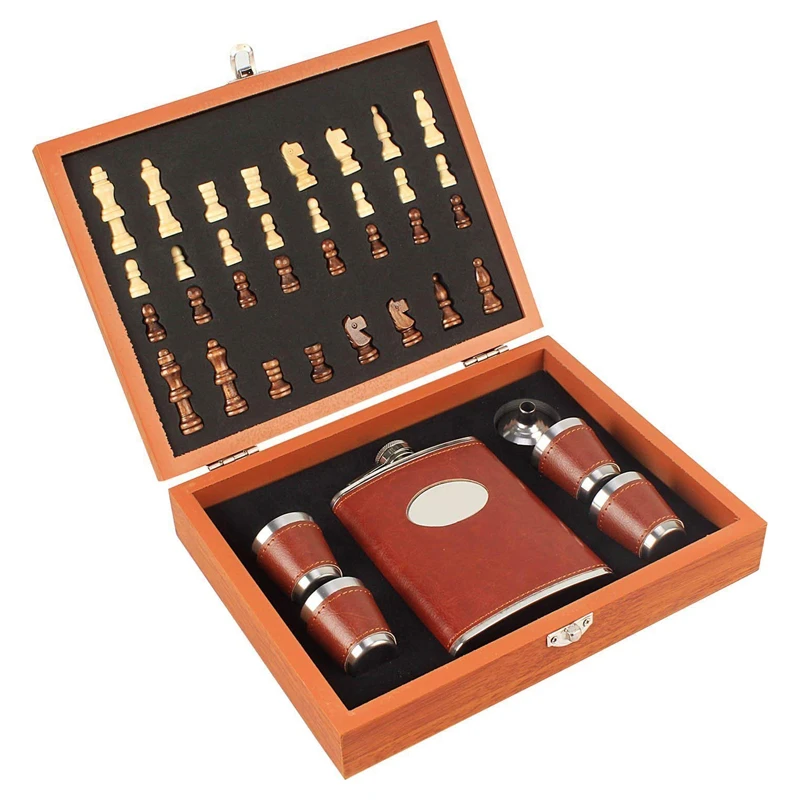 Der Koffer ist aus lackiertem Holz gefertigt und innen mit Samt ausgekleidet. Der Koffer schließt mit Riegeln und hat einen praktischen Griff. Der Flachmann und die Gläser sind aus Edelstahl gefertigt und mit Kunstleder überzogen.Innen:1 Flachmann4 Shots/GläserTrichter